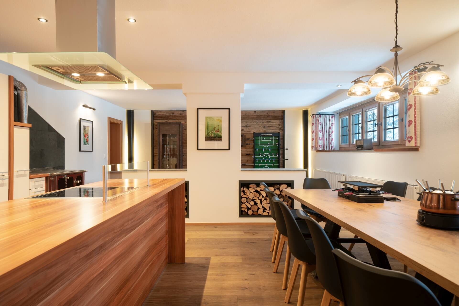 Im Stadlchalet haben Sie im Winter eine perfekte Unterkunft für Großgruppen, da wir alle 3 Wohnungen, sowie einen Aufenthaltsraum miteinander verbinden können. - Somit können Gruppen mit einer Größe von bis zu 10 Personen (mit Notbett sogar 12 Personen) einen tollen Urlaub verbringen. Der Aufenthaltsraum verfügt über eine große Küche mit großem Esstisch, Dart, Tischfußball, Nintendo Switch, sowie Brettspiele, welche Spaß und Unterhaltung garantieren.